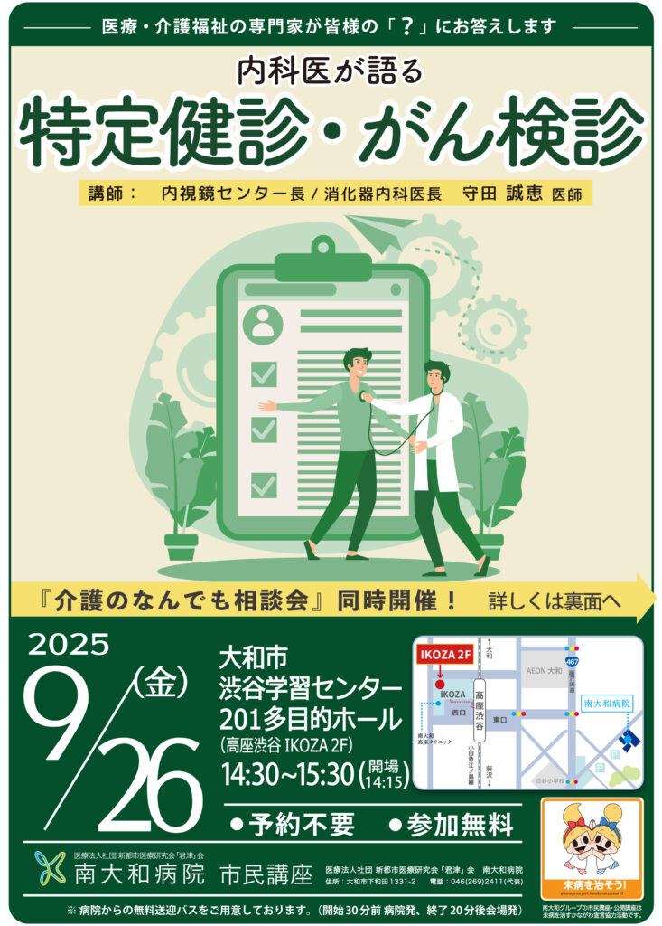 9月はがん制圧月間です。1960年からだそうです。南大和病院の市民講座も、健診をテーマにしました。